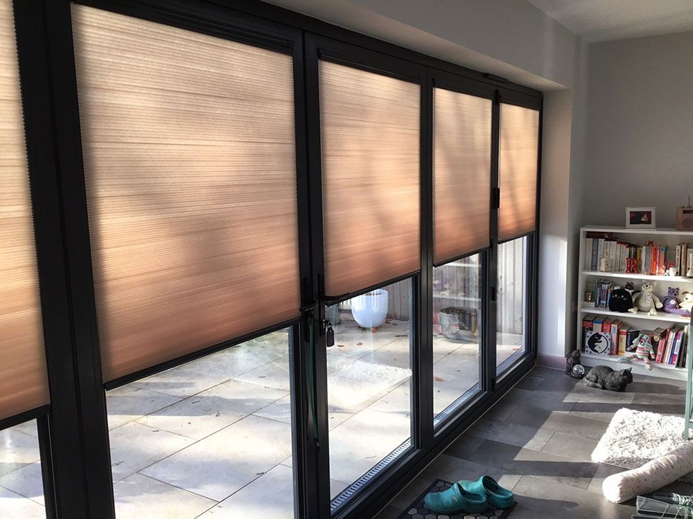 - Honeycomb, (a double fabric) offers superb energy efficiency whilst giving a smooth and stylish finish. There are no tension cords on view as they are between the two fabrics.